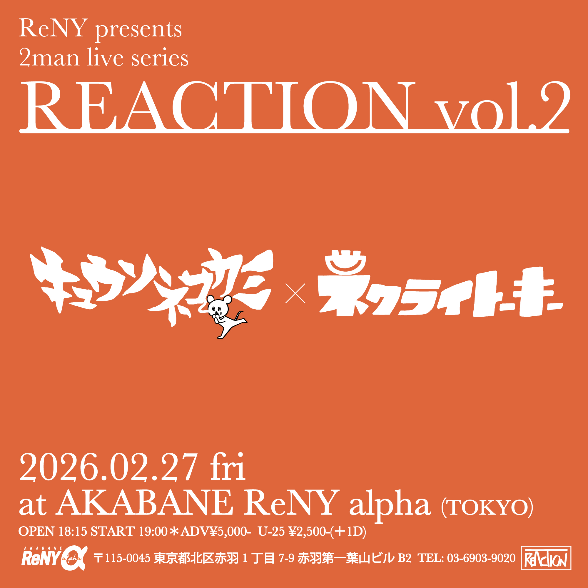 2/27(金)ReNY presents「2man live series REACTION vol.2キュウソネコカミ × ネクライトーキー」@赤羽ReNY alpha